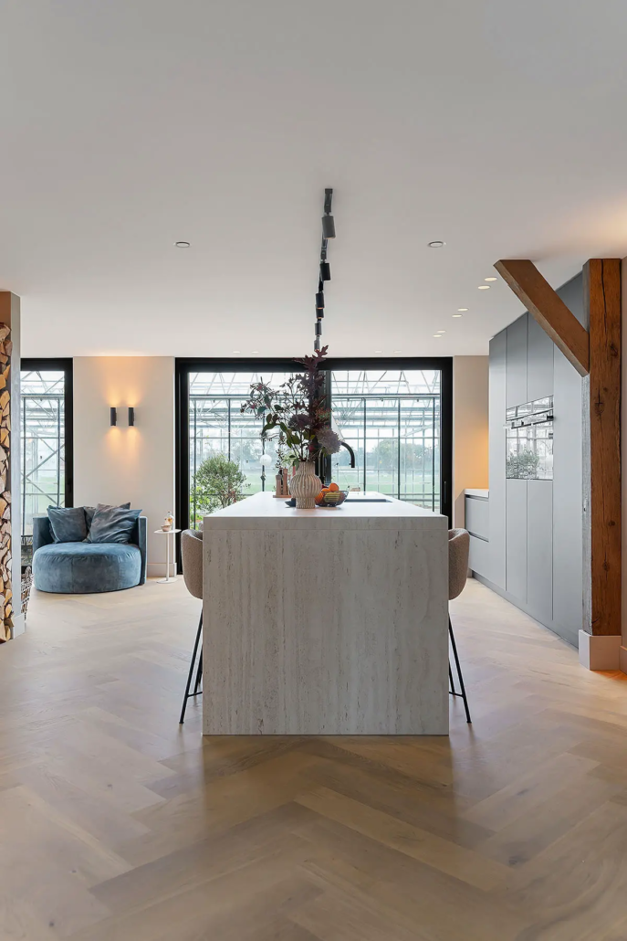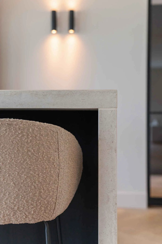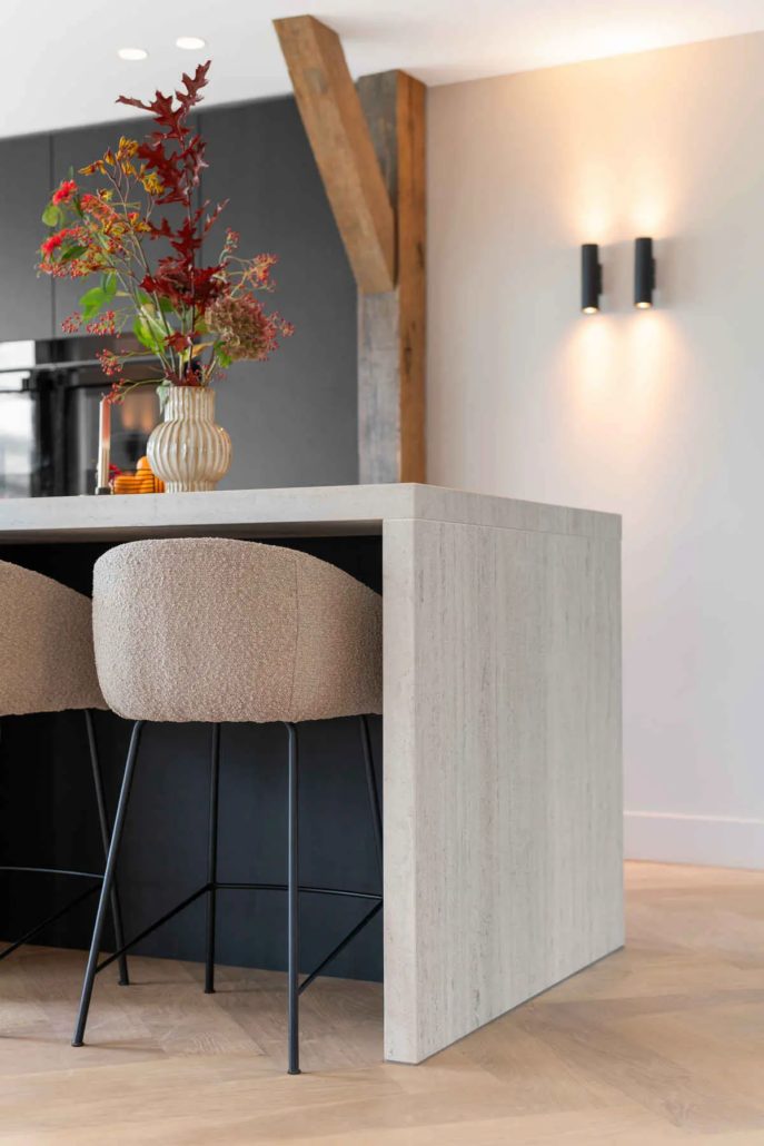 Naast het uiterlijk was ook de indeling belangrijk. “We wilden een praktische keuken waarin we fijn konden koken, maar die ook mooi in de ruimte zou staan.” Door slim gebruik te maken van kastruimte en werkoppervlak ontstond een keuken die zowel praktisch als sfeervol is.