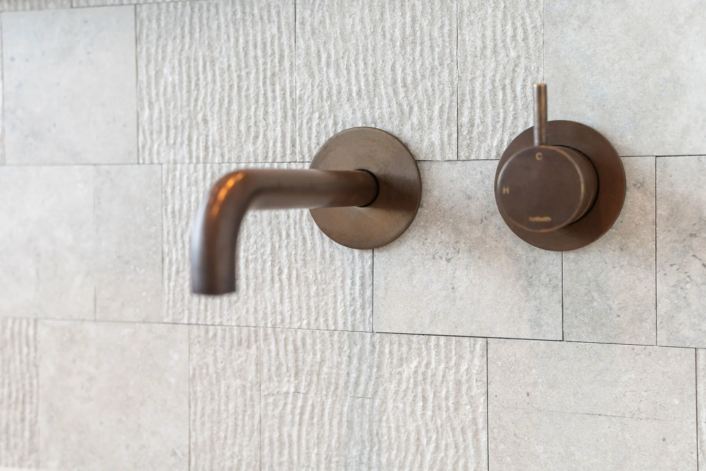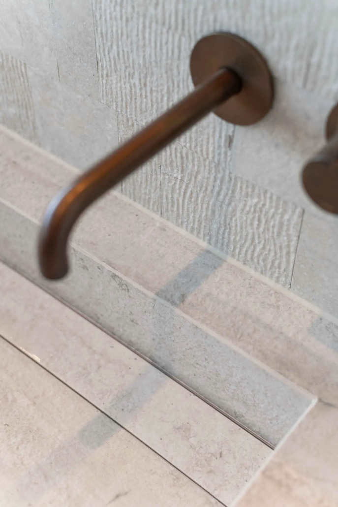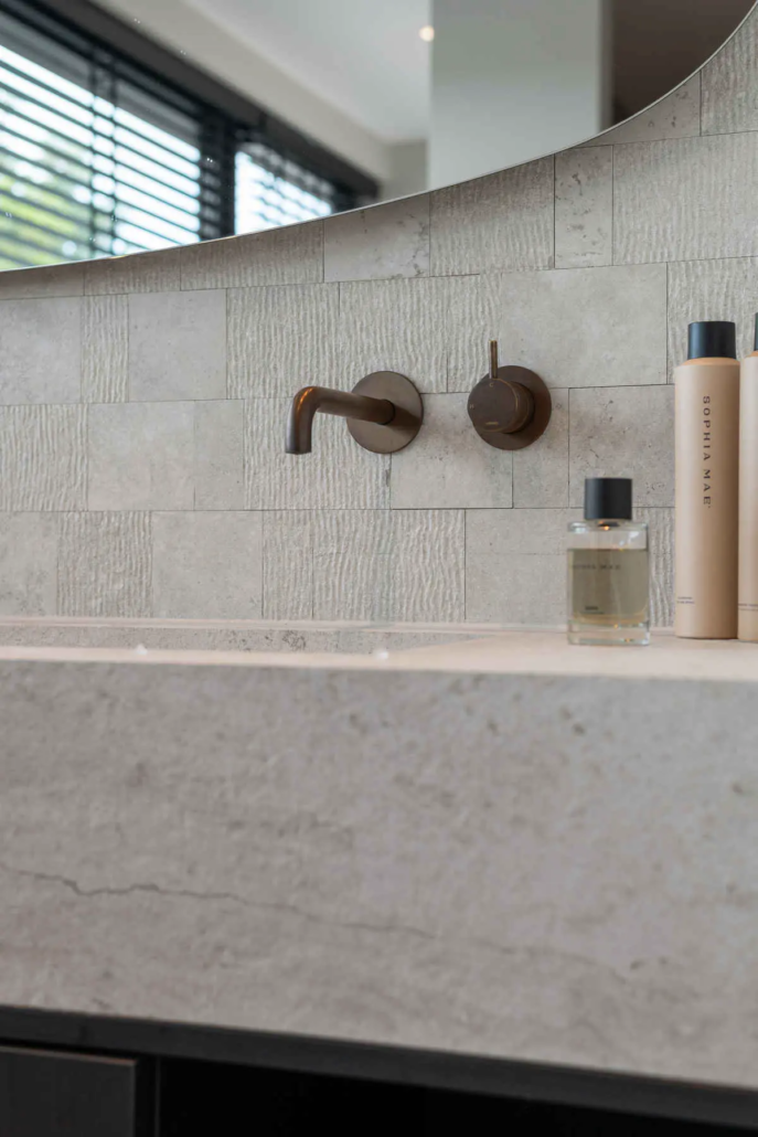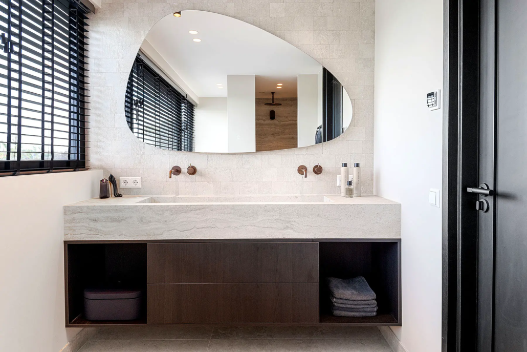 Zelfs in de badkamer komt de houtlook terug. “We hebben het zwevende onderstel van het badkamermeubel in dezelfde stijl laten maken als de keuken en daar hebben we zelf een bovenblad op gezet. Zo loopt het ontwerp overal subtiel door.”